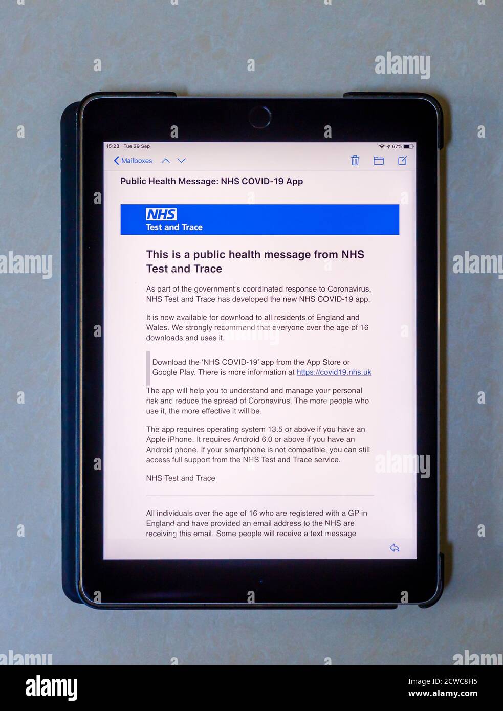 Email Public Health Message On The Screen Of An Ipad With Details Of The New Nhs Trace And Test App The Nhs Covid 19 App And Download Instructions Stock Photo Alamy
